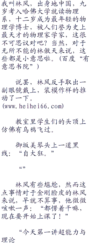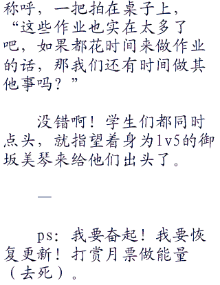 教室学生们齐刷刷的目光落到了御坂美琴身上,她们连猜都能猜得到常盘台中心为了请到这位天才物理学奖,是付出了巨大的代价,如果因为得罪教授而导致教授辞职的话,那理事会一定不会放过大家的。