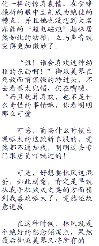 “呵,你这种豆乳一定无法欣赏这种款式衣服的美丽,就算你穿上别人也看不出来吧。”食蜂操析目光下降盯着御坂美琴明显还没有发育的胸前,一副若有所思的模样。