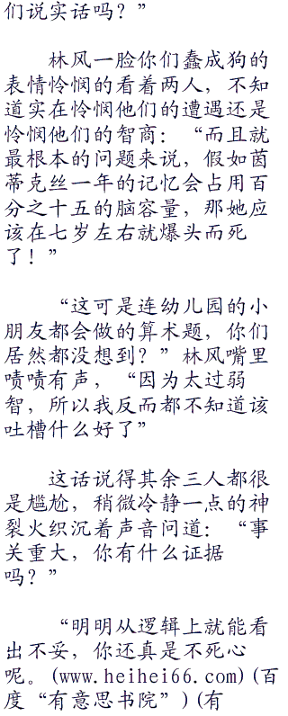 “这不是好话,而是事实啊。”林风叹了一口气,“公猪配母猪,一样笨一样蠢,不是很“一零零”相配么?”
