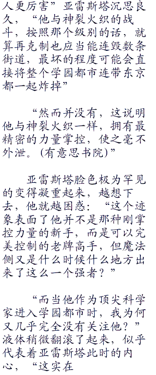 “不过居然同时与魔法侧存在联系,这倒是我没想到的新情报,”亚雷斯塔眯了眯眼睛,“是在感兴趣大楼的材质吗?可惜即使是自动书记状态的**目录,都不能做到破坏‘它’的话,那么接下来,你又打算怎么做呢?”