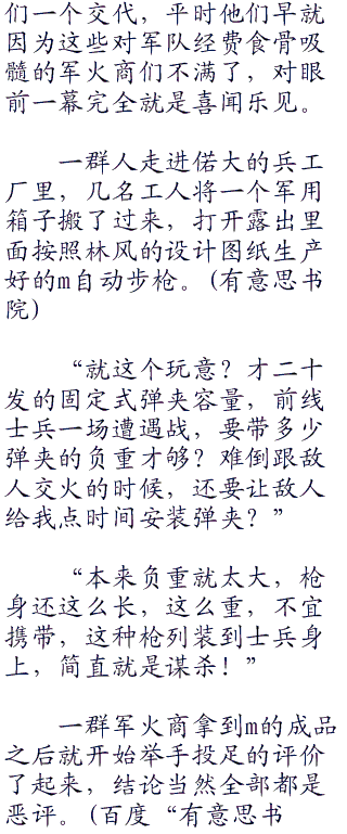 这群兵工厂的boss掌管着武器生产流水线,每一种枪支都他们来说都代表巨大的利润,林风这突然出现拿着设计换这些巨大利润的枪支,肯定让他们十分不爽。