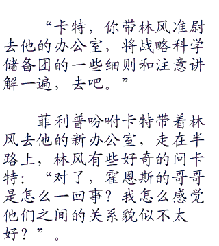 卡特对着林风微笑道:“林风准尉,来,我要给你介绍一个人,战略科学储备团的负责人菲利普上校,哦,抱歉,您的队员要先留在这里。”