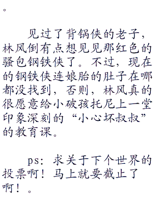 林风心想这个霍维克可能才是隔壁罗杰斯叔叔的儿子吧,要不要打个电话让罗杰斯叔叔跟他见上一面,说不定见面的时候,罗杰斯看着霍维克眼泪都会流下来了