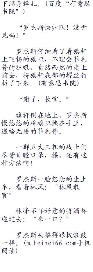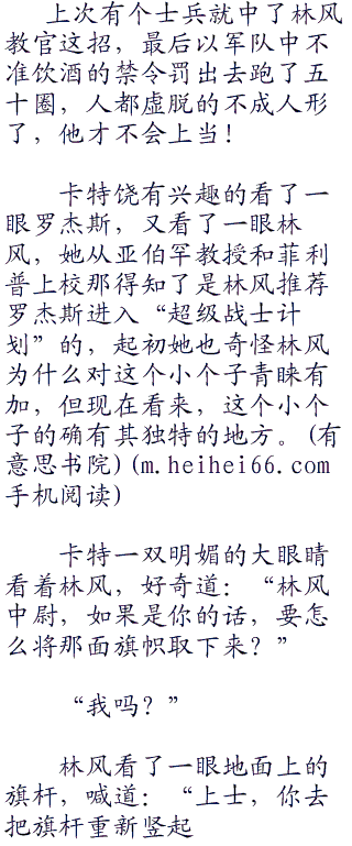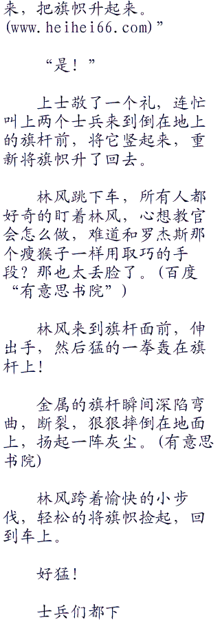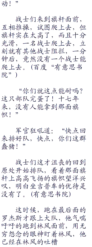 很快,战士们跑到一个旗杆面前,菲利普大声喊道:“这面旗帜代表你们只跑了一半,第一个拿到旗帜的人,就能和卡特特工以及林风中尉坐吉普车回去!”