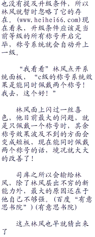突然间,系统的下一条提示音又出现了:“检测到玩家已经顺利开启所有称号的d级,称号系统升级·c级!”