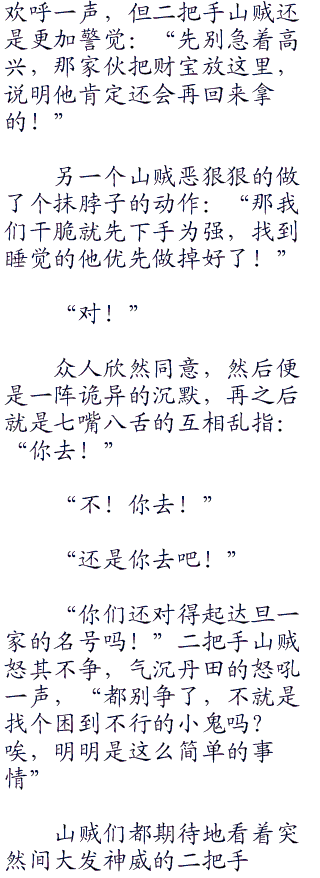 二把手山贼一咬牙,下了决定,他回头看着自己的手下们,发现个个都是一副深以为然的模样。