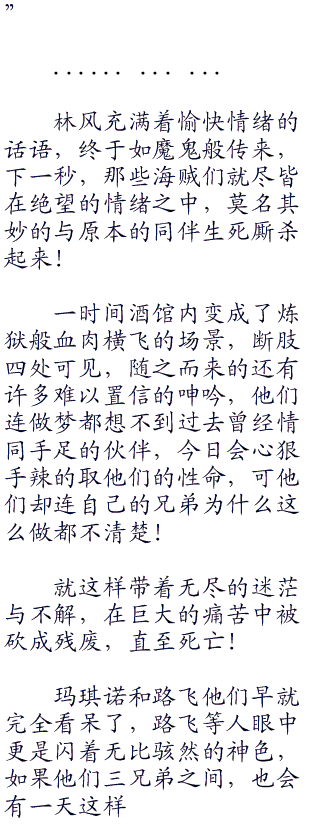 艾斯和路飞刚要吵吵嚷嚷的开口,就又被领头大汉很不爽的一巴掌扇了回去,因为这时候他才注意到角落还有一个无比安定的顾客在,那悠然自得的模样简直就像是完全不把他们放在眼里似得。