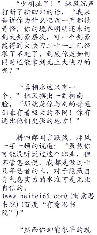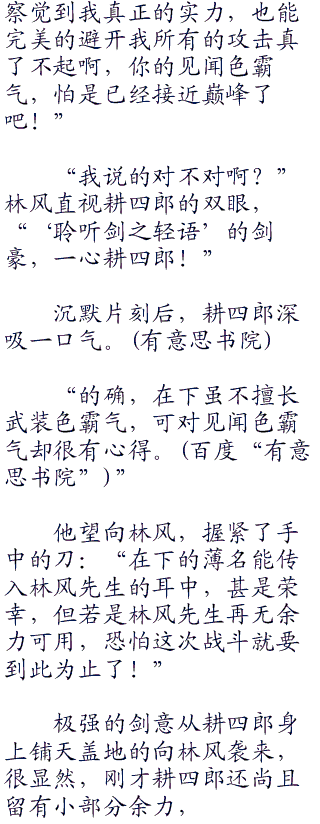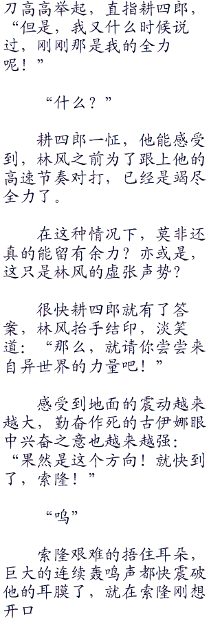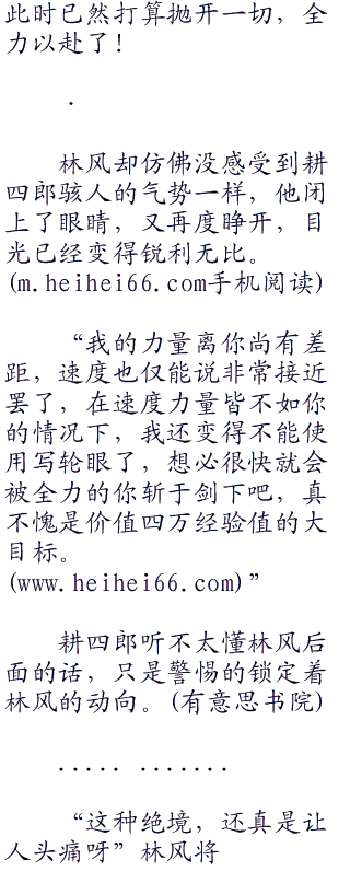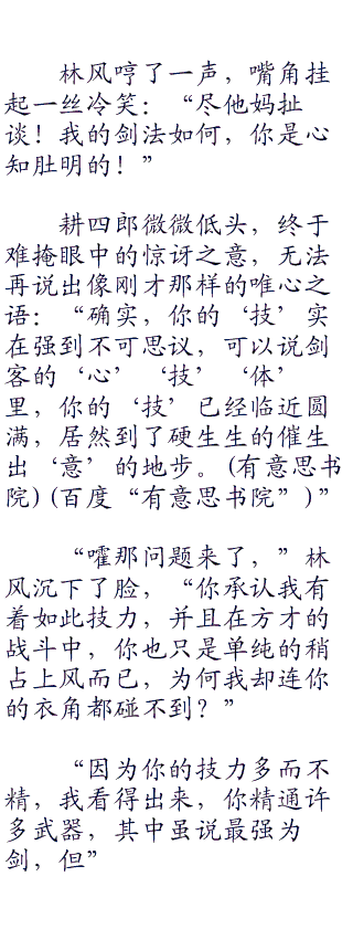 “因为你的刀法只有形,而没有意,”耕四郎静静的看着林风,“所以你伤不了我。”