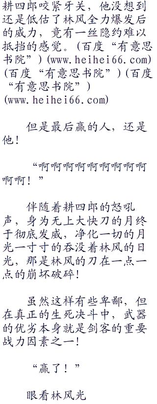 耕四郎听后已经不知道该说什么好了,林风继续说道:“既然普通的打斗无法取胜,那就干脆孤注一掷好了!仔细想想,我最擅长的是什么只有把最擅长的方面一次性爆发出来,才有击败你的可能性!”