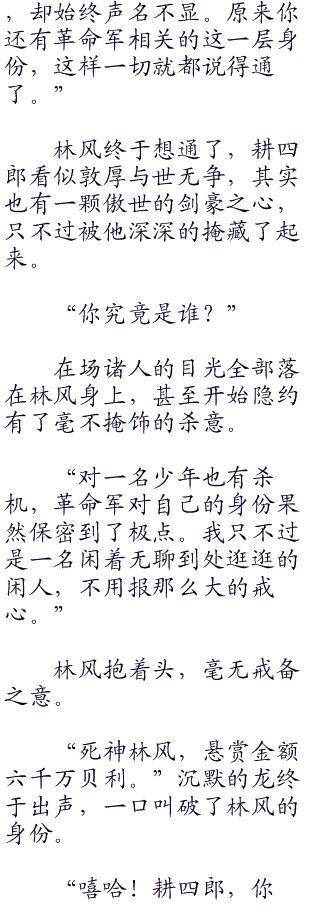 不知为何,看着这一双平淡的眼睛,耕四郎内心就一点都不怀疑林风的话,甚至下意识的就认为林风完全有守护古伊娜和索隆的能力。