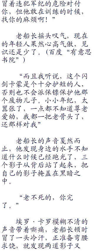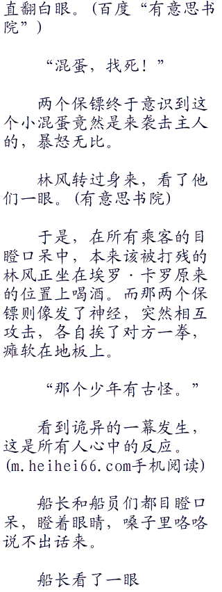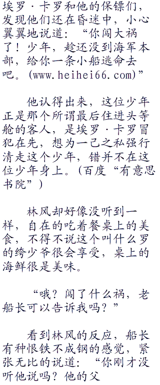 少年心头火起,将酒杯摔在地上四分五裂,大吼道:“什么!没有了?你知道我是谁吗?我叫埃罗·卡罗,我父亲是海军本部的上校闪剑卡蒙!听着,十分钟之内,我要看到一间收拾得干干净净的头等客房!”