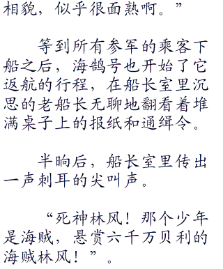 “各位乘客请注意,各位乘客请注意。马林焚多就要到了,马林焚多就要到了。前来海军本部参军的乘客,请收拾好您的行李,等待下船。”