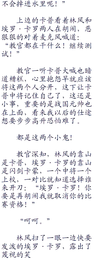 教官们碍于卡普和林风之间不明确的关系,没有阻止林风无组织无纪律的行动,但也没有阻止新兵对于林风的嘲笑,任由难听的话语在赛场上飘荡。