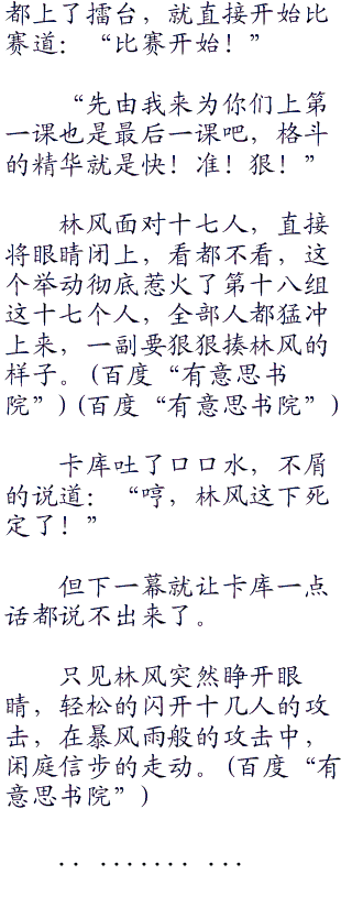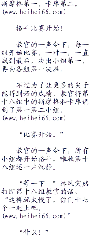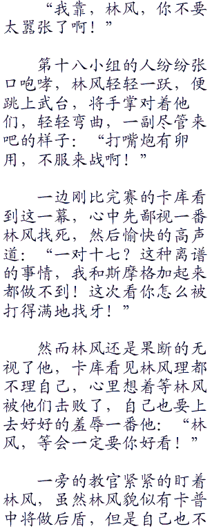 林风毫不客气的就鄙视卡库一顿,气的卡库抡起拳头要揍林风,旁边的新兵一看,立刻拉住卡库,不然恐怕就要打起来了。