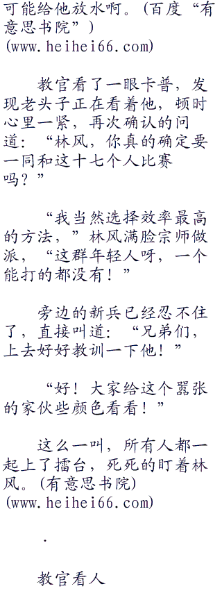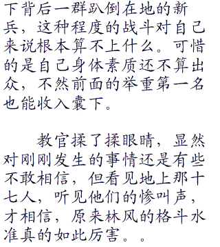 林风拿起水瓶喝了起来,一副看不起这群新兵的样子,简直比老兵还老兵。