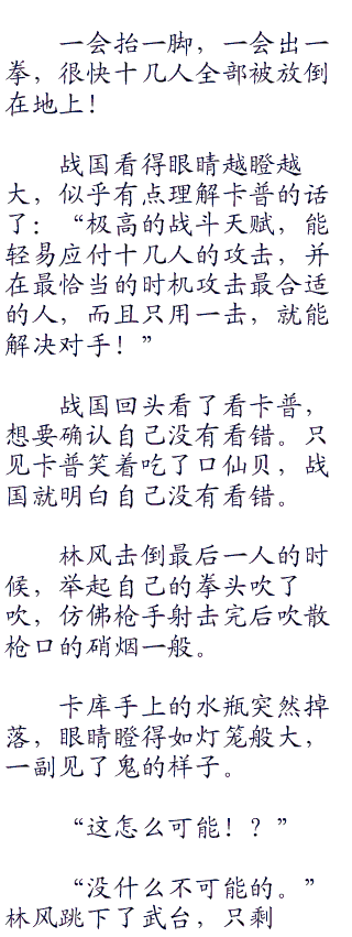 “林风!在格斗和剑术上我一定要当面打败你!”卡库心中恨不得将林风碎尸万段。