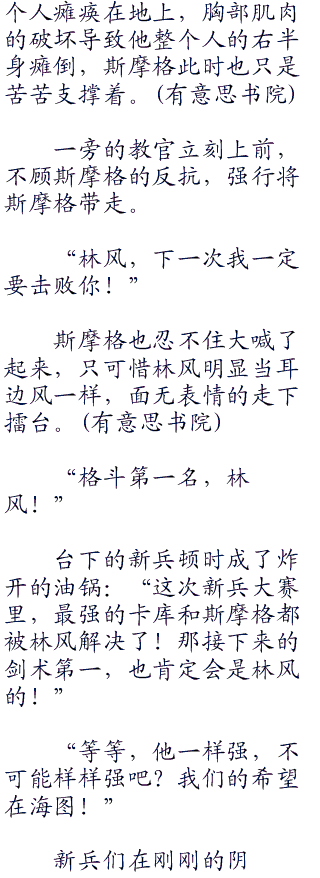 “那个斯摩格,实际上只是靠强出一大截的身体素质,才能勉强试着与林风交锋啊”战国一看就知道,“但也到此为止了,他的前臂和胸口处的肌肉已经被林风破坏,果然这个叫林风的新兵的进攻,都有让人透不过气的感觉。”