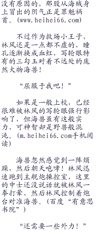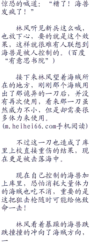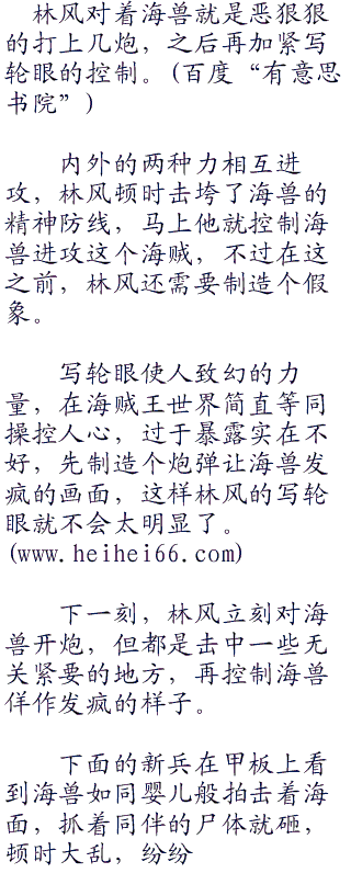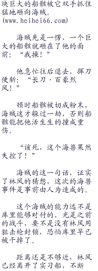 库里不用看,都知道是林风在放黑枪。在实习船里,要是有枪法这么好的老兵自己肯定知道会是谁,所以这只可能是刚刚帮助自己杀掉三只海兽的林风开的枪。
