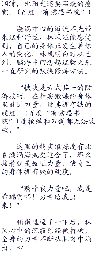 林风的身体被漩涡中心的海流包裹着,一股股海流不断从自己身上掠过,先前被漩涡外层海流致使的身体疼痛感已经完全消失,留下的只有比丝绸还要