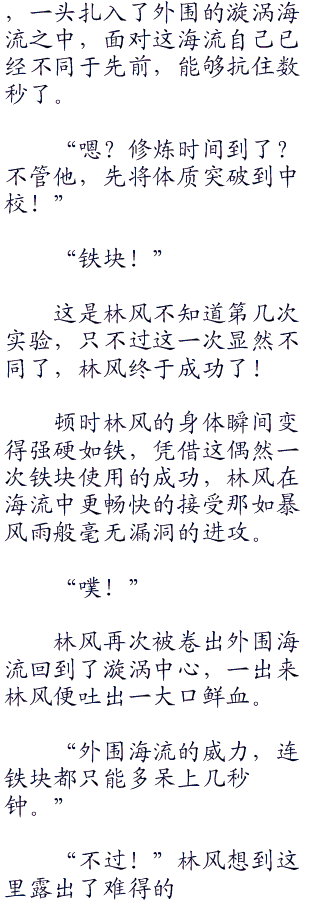 数次冲入冲出,林风的身体遭受到数次压爆的危险,但好在都危险前零点几秒被卷入了漩涡中心,只要再慢上这一些,林风就会被光荣牺牲,彻底染红这个漩涡海流。