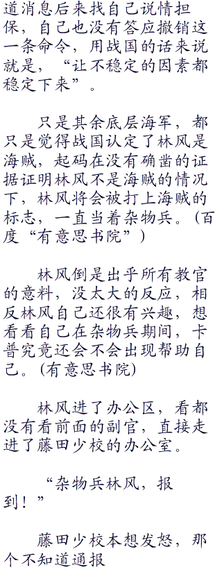 林风的瞳孔忽然缩小了一下,然后立刻恢复常状,心中道:“看来战国已经开始干预了,不过没有想到的是将自己贬为杂物兵了。”