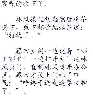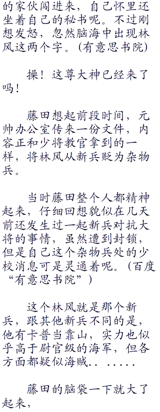 “你不需要训练!”教官接着说道,“你现在已经不是新兵了,现在归入杂物兵里,马上去藤田少校那里报道。”