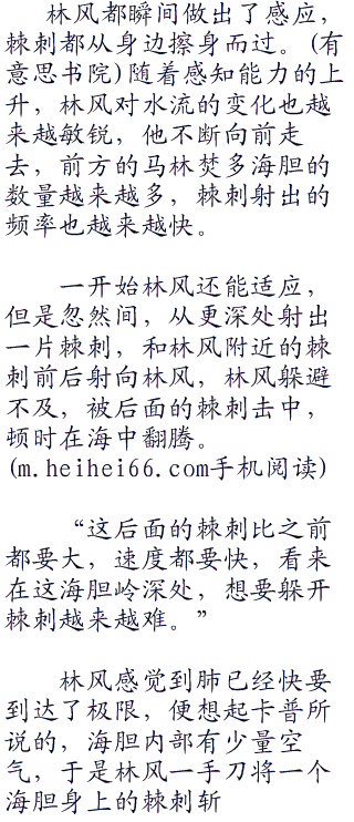 林风摸了摸身上的疼痛处强忍着,但下一轮棘刺又马上出现!林风躲避不及又再次被击中,将身前的海水都染成深红色。