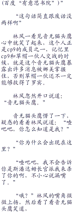 一边的的音无猫头鹰回过身子,看着斯潘达姆这个cp9的最高长官说道:“什么事长官。”