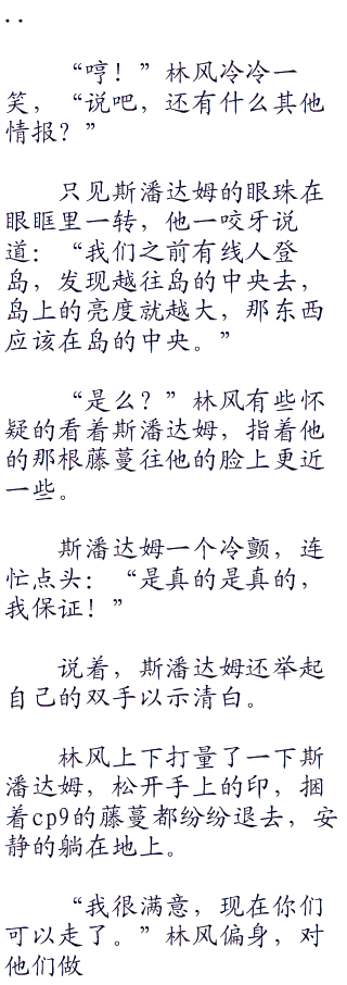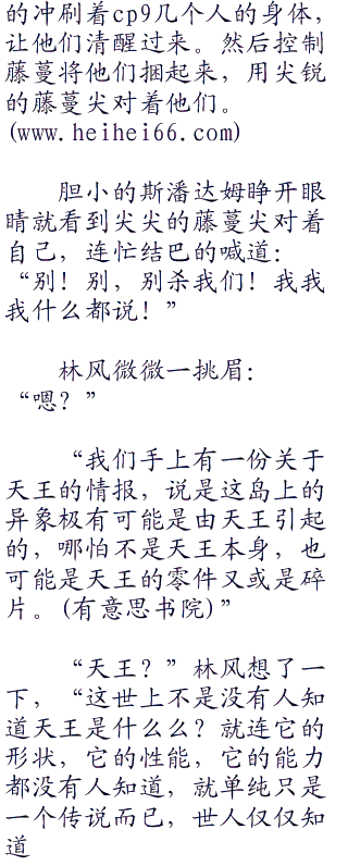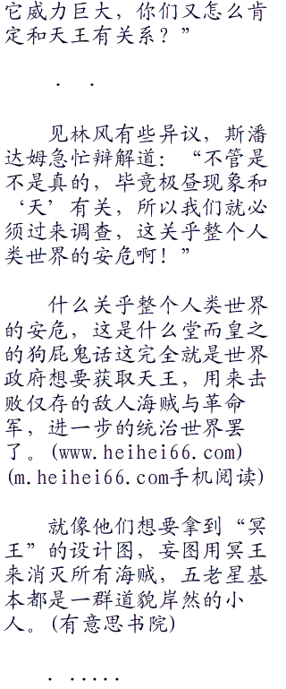 “天王,听他的名字就能猜到,必然和天象有关。所以世界政府才会派你们前来调查无夜岛,看看有没有天王的下落吧?不过,可惜的是,你们都弄错了,无夜岛和天王并没有什么联系。”