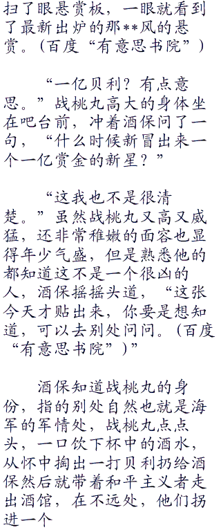 马林梵多的港口,刚从西海消灭了一处海贼据点的战桃丸走进了马林梵多的一家不大的酒馆。剿灭海贼归来的第一件事,就是喝个痛快。