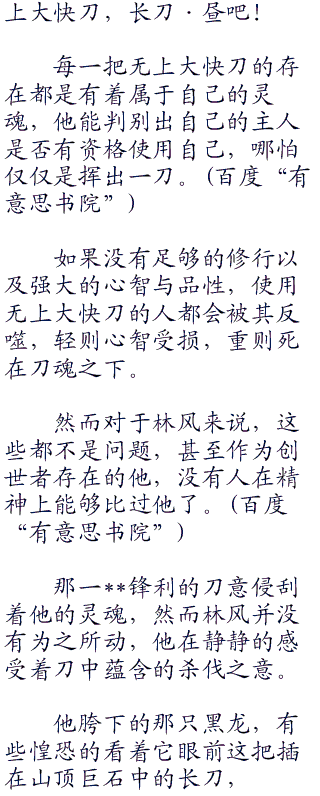 “我猜你是在守护这把无上大快刀吧,我也不想杀了你,放你走可以,但是你必须帮我一个忙。”