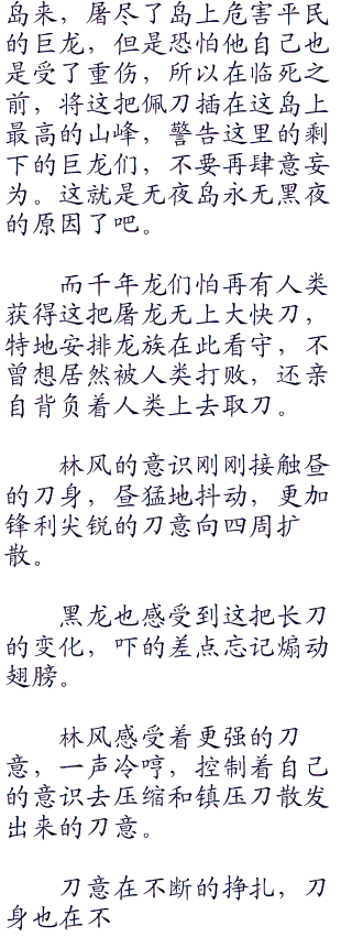 林风指了指背后那座山:“你驮我上去,帮我拿到这把刀的话,我就放你走。这样你也就自由了,不用在这座岛上守护这把刀了,你看怎么样?”