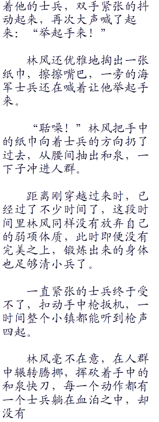 突然一旁传来阵阵吵闹,林风一偏头就看到一群穿着海军制服的士兵,端着枪走了过来。