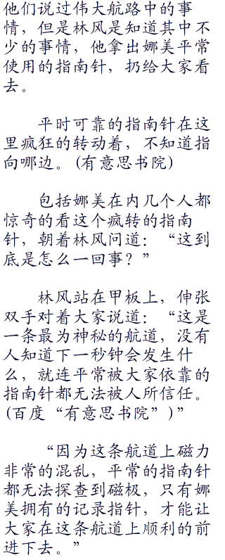 四个人忙前忙后,弄了小半天,而船也随着激流,更加快速的朝着颠倒山驶去。