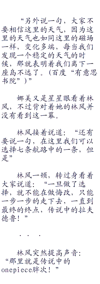 很快,激流将这艘船送上了颠倒山,罗宾沉着不语,而古伊娜也尽力的保持着自己心目中剑客的风范,在娜美的大呼小叫中,他们正式踏上了伟大的航路的大门。