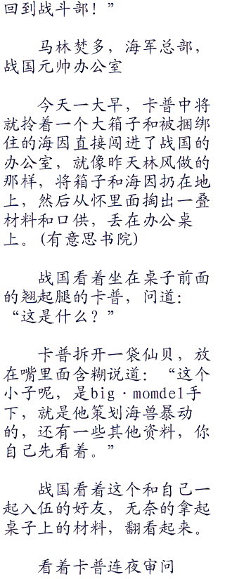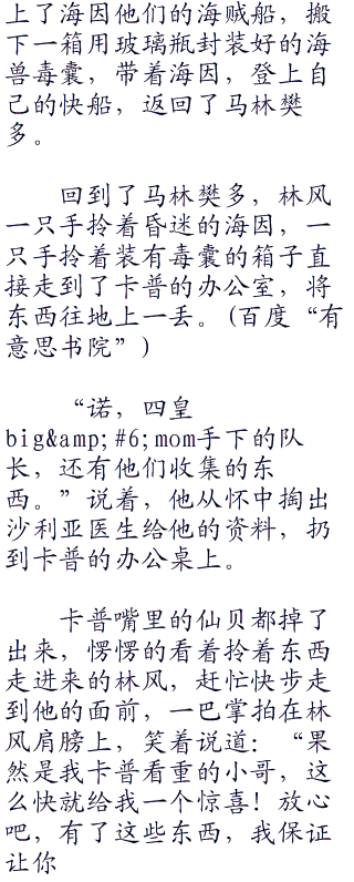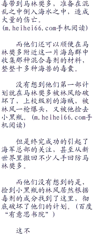 为了不让海军继续增派人手,并且希望能够让他们转移注意力,big·才派海因队长来这里对马林樊多制造了一起海兽暴乱,并将自家手下用毒高手研制出来的混合型海兽