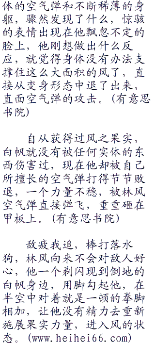 木质的甲板,被林风直接穿出一个大洞,而下落的一瞬间,白帆就重新变成风,躲避了伤害。