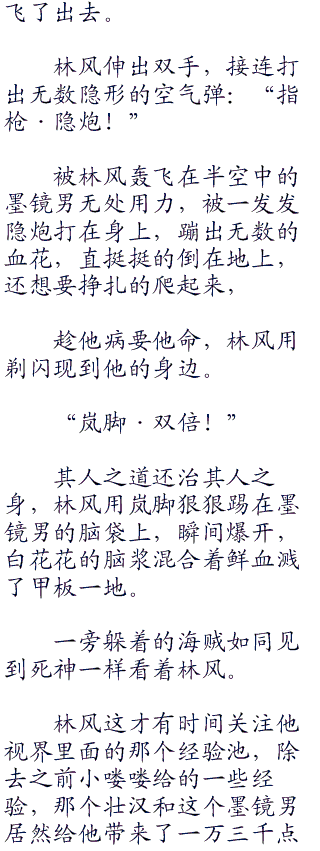 在这艘不是很大的海贼船上,林风就这样不断溜着墨镜男,还不时用着指枪·隐炮或是岚脚·双倍来干扰对方对自己的追踪。