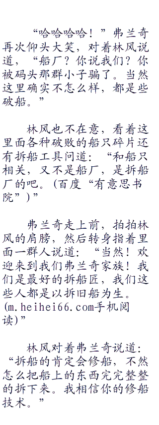随后他们就见到许多市民奔跑着如鸟兽般散去,只余下一声快意的大笑,林风已经基本确定了他之前猜测的的东西,这里就是弗兰奇的拆船厂。