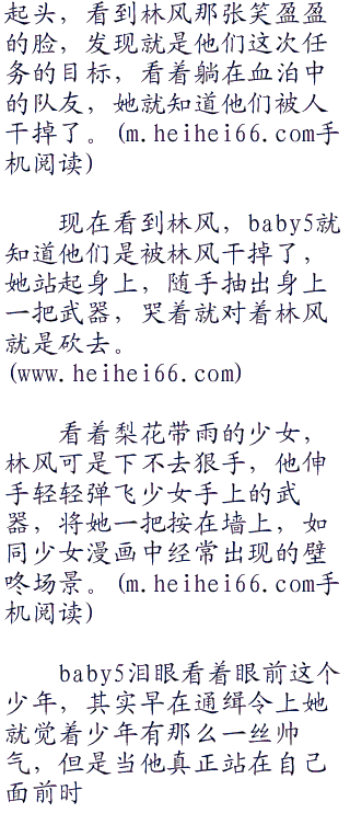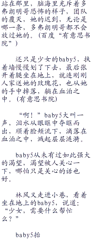baby5刚走进巷子,就被巷子里面一片血迹狼藉的场面惊呆了,她呆呆地