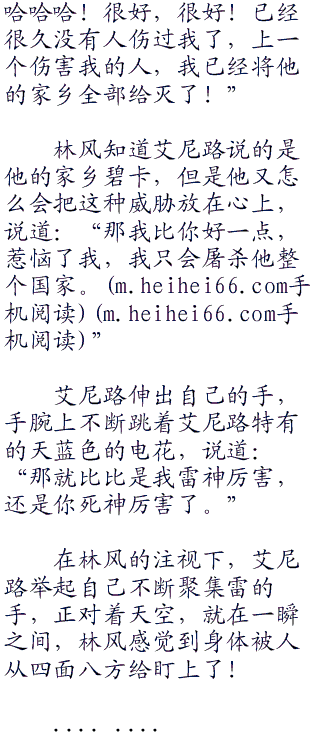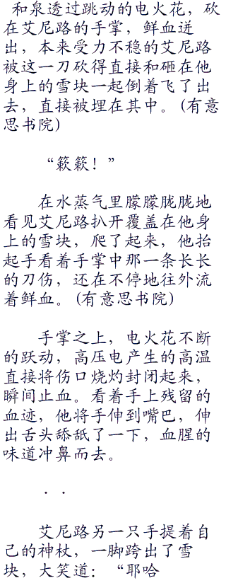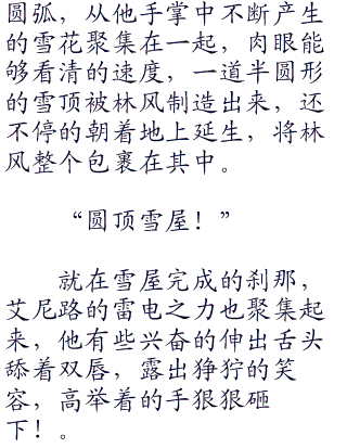 能看到艾尼路的双拳不断闪烁着高压电火花,他将自己身体产生的雷转换成能够产生高温的高压电流,试图一拳击散林风那由冰雪组成的身体。
