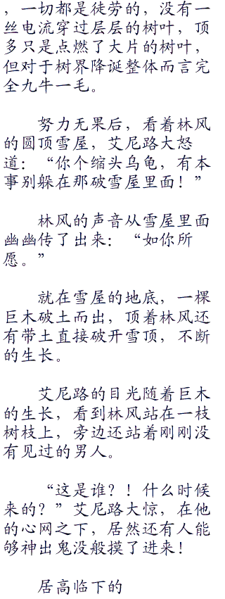 在圆顶雪屋中林风能够感受到雪屋在雷之电柱冲刷下不断的颤抖着,强烈的高压电流甚至透过雪屋壁扩散到里面炸开。