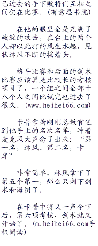 坐在观众席的众位将领也在那边议论纷纷:“看来这几个好苗子都被林风刺激的不行啊,出手一个比一个狠,但是依旧没有林风的那种快准狠,要是他们遇到了林风,恐怕也不比他们的手下败将强上多“六九七”少。”