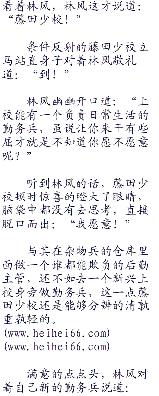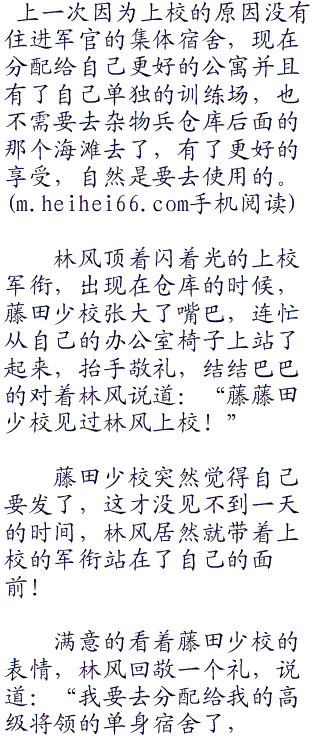 在靶场上拍完最后的大合影后,在场的人都一一散去,林风从卡普手上接过一张纸,上面写着分配给他最新的军官单身公寓,一人一间。
