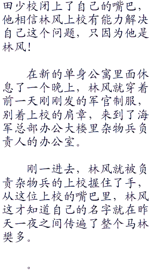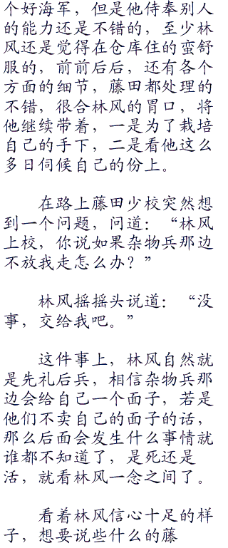 最后只剩下五六个人留在原地,没有被叫上名字,其中就有“闪剑”卡蒙的儿子卡罗,他正呆呆的看着自己的同伴还有和自己父亲一样军衔的林风,更加生不起复仇的念头了,现在他心中想的就是好好的在来一次,努力进入海军。