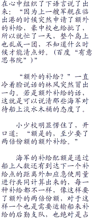 对于淡水木桶的管理,海军有着非常严格的规定,想这几个海军的违规操作明显不对,这是其一,其二就是他们对淡水的冷淡的态度,淡水对于在海上航行的人来说就是救命的东西,海军的规定不可能让他们这么浪费。