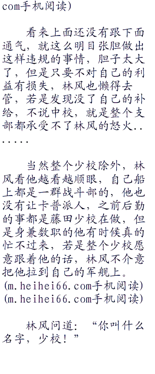 后勤部的将级“八零零”以下的军官军衔在和战斗部的相比都是降一级的,也就是在林风的面前,若这个最高长官也是一个上校,那么他对林风只是一个中校,更何况他只是一个中校,在林风的面前也只能算一个少校,就算藤田少校也有资格和他平起平坐,他现在的隶属战斗部,而不是后勤部了。