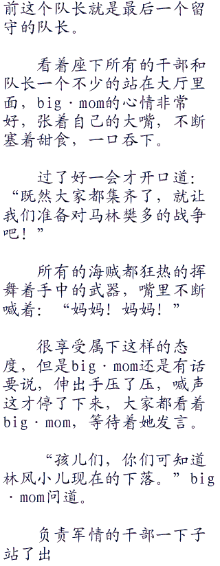 电话虫那头的卡普也谨慎地看了下四周才对着送话器小声说道:“big·组海贼队伍对马林樊多宣战,发动第二次顶上战争。希望你赶紧回来做准备。”