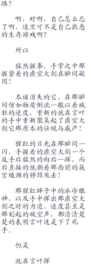 而后,言叶只听见桐子微微的一叹气,而后:“亮柴刀吧,骚年!”