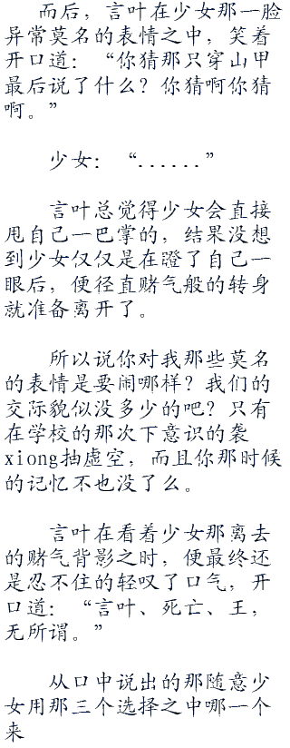 不,按照诗乃那个傲娇的猫属性来说,应该在一边点着一边说着那种家伙......谁管他是死是活啊......的话语,然后直接关掉卫星扫描接收器的吧?